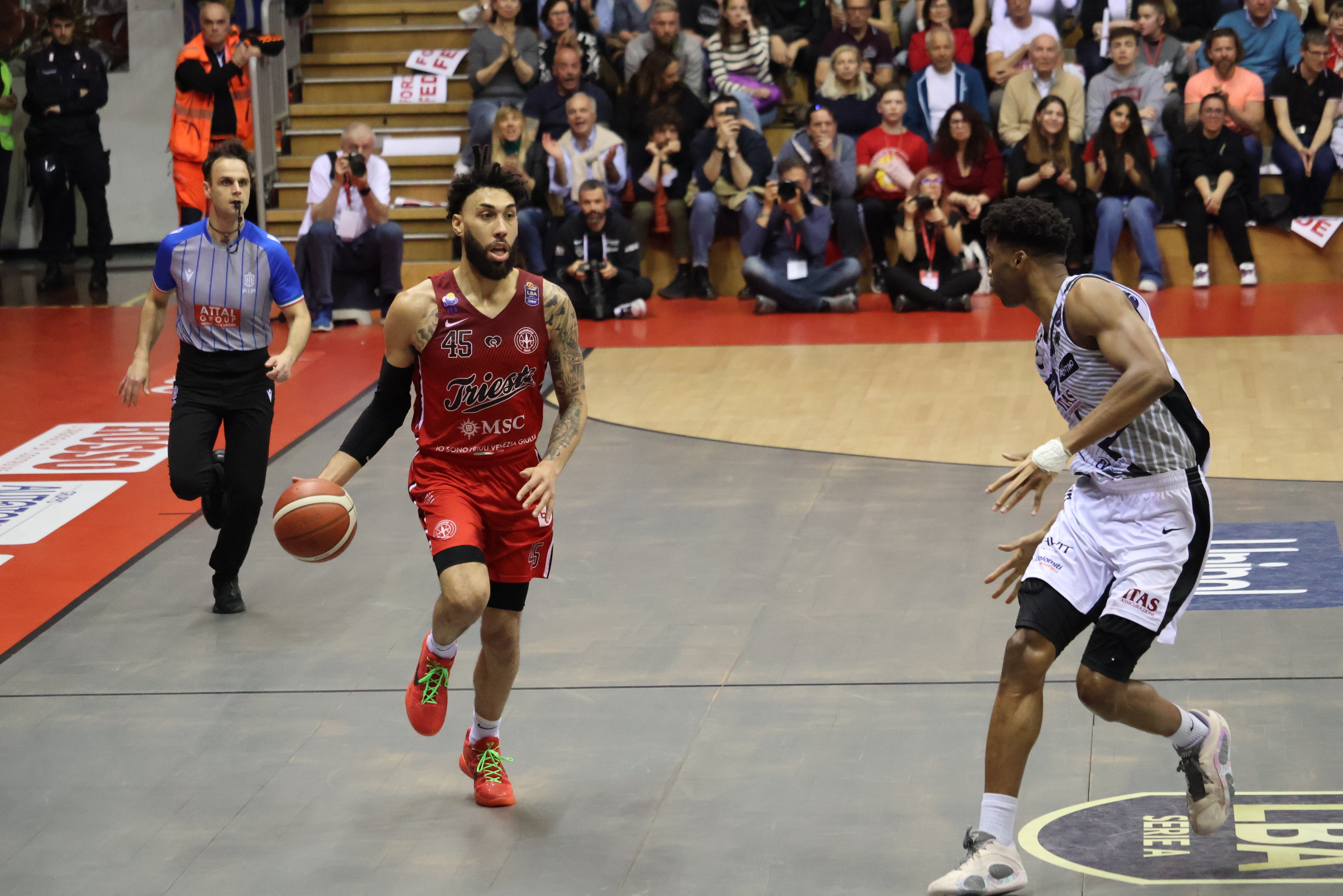 Nel secondo quarto continua lo strapotere fisico degli ospiti anche se nei primi minuti i ragazzi di Christian tengono botta. Subito due canestri per Valentine: 28-32. Sul 32-36 Trieste fallisce il meno due e dall’altra parte cinque punti di Ellis valgono il 32-41. Triple per Lamb e Valentine: 37-44. Poi Trento scappa via e con un parziale di 10-4 va a metà gara sul 41-54.